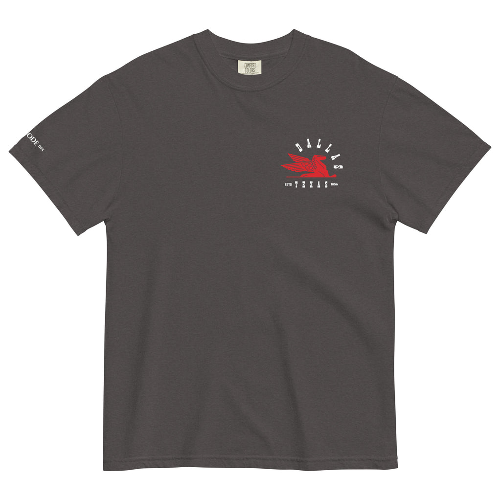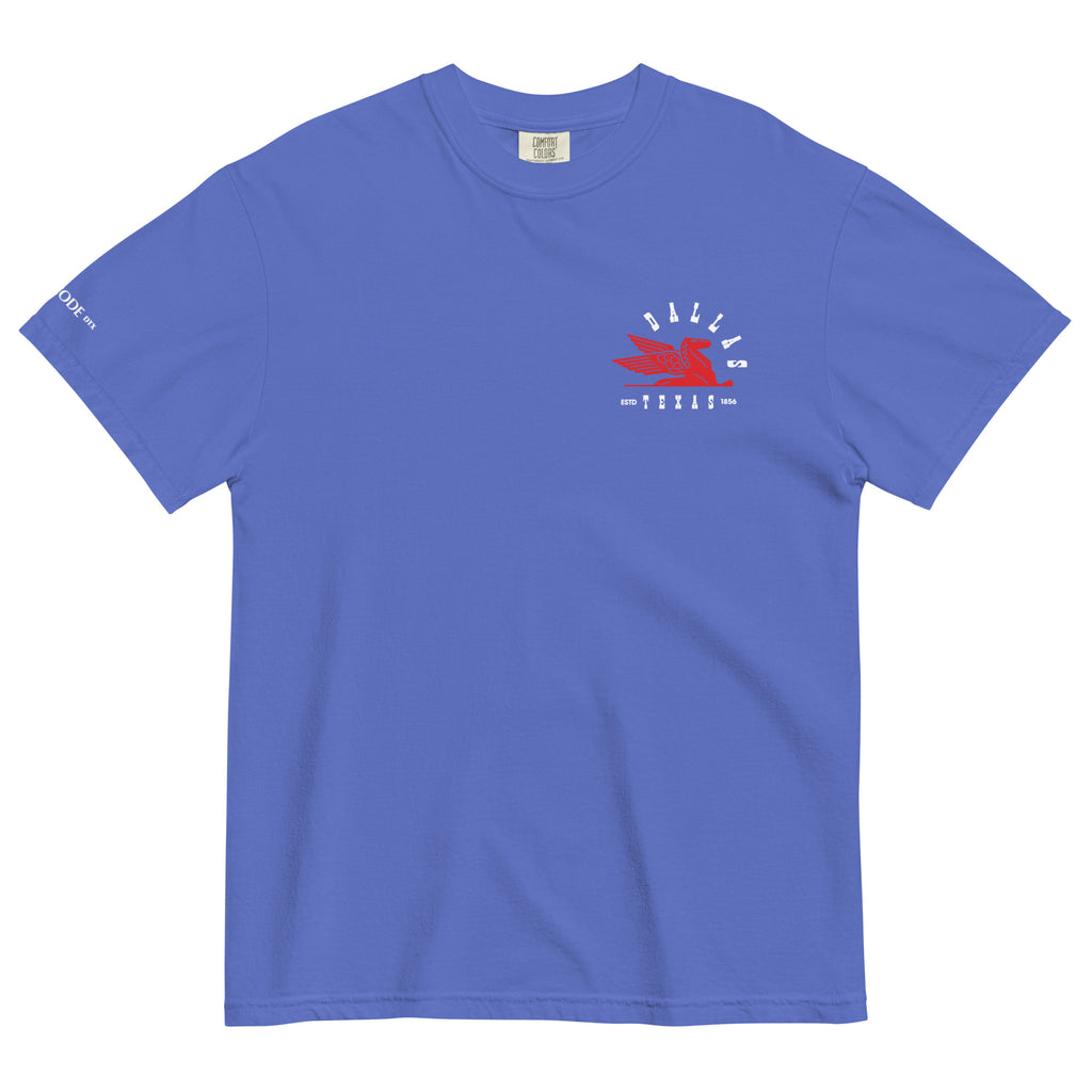 A Dallas classic — The legendary red Pegasus, a symbol that’s been flying high over the city since the 1930s. Paired with bold western-style lettering, it’s a nod to the city’s roots with timeless, throwback appeal. Printed on Comfort Colors brand tee that's thick and structured while also super soft and breathable. Available in washed Blue and Graphite colors.
